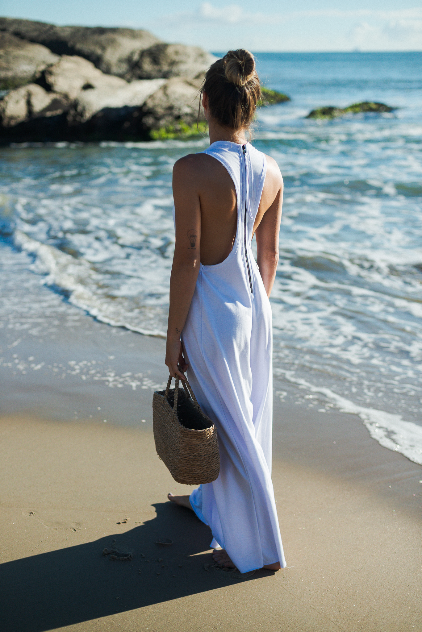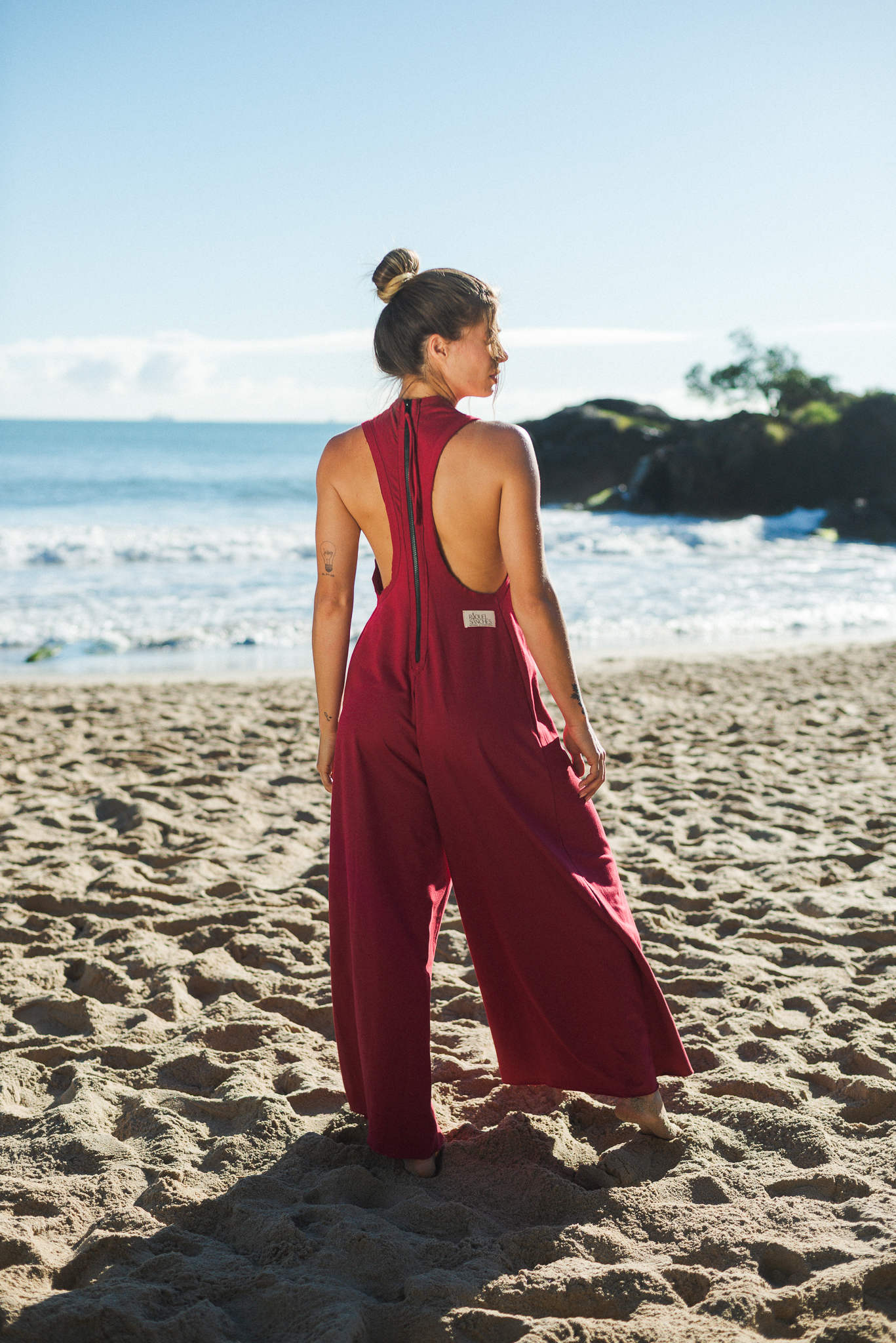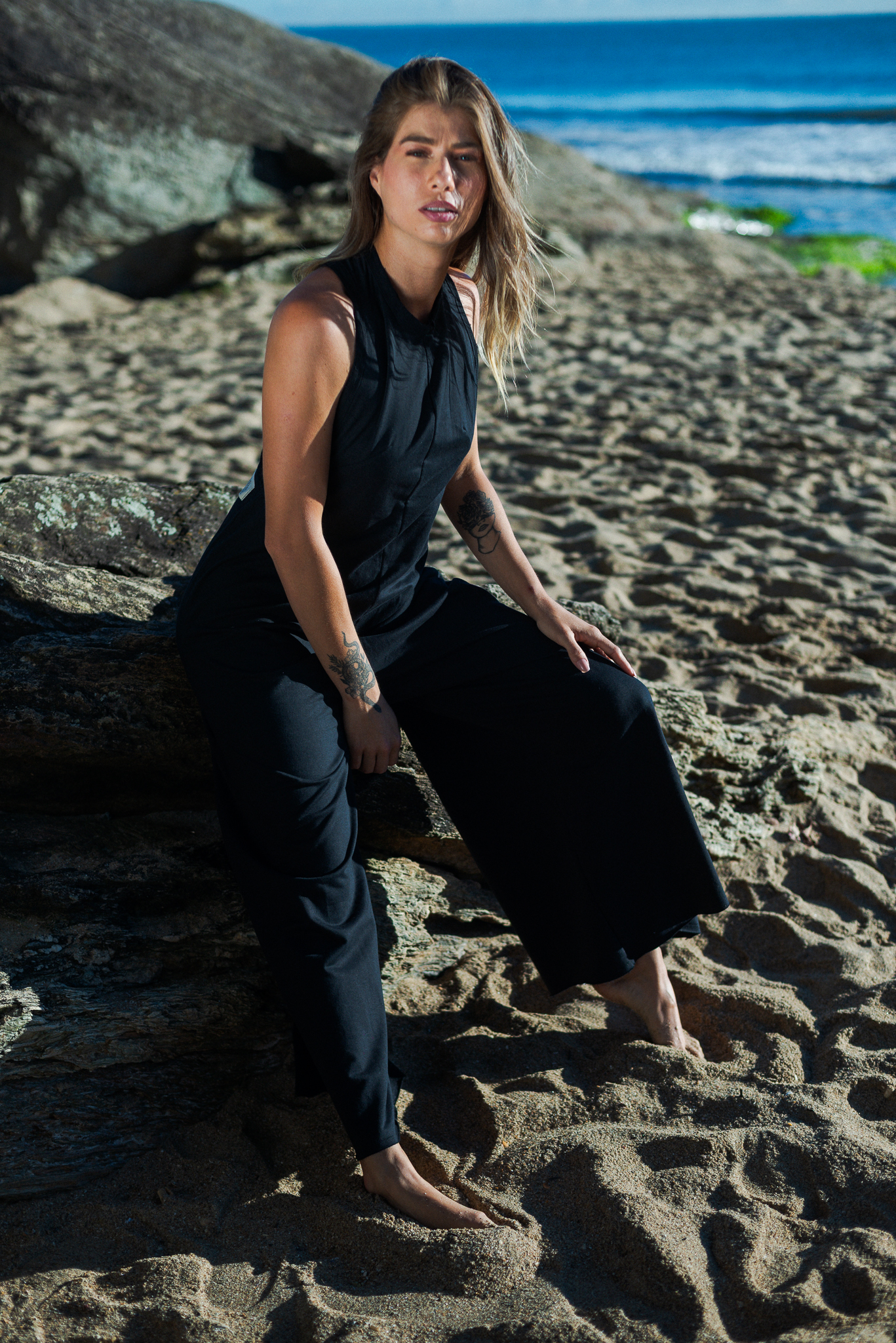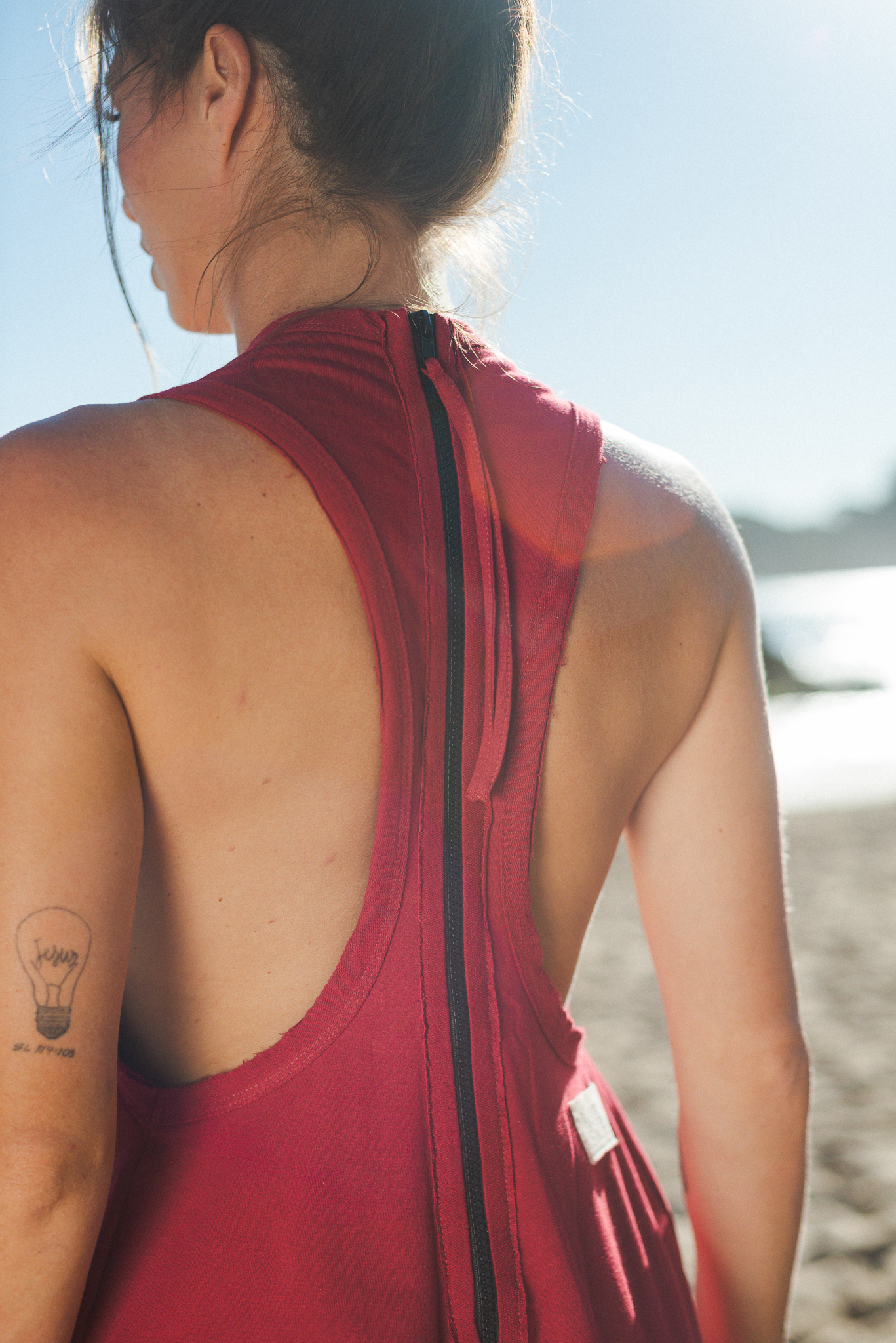 Nas costas, o fechamento em zíper aparente recebe um puxador alongado (cursor com alça), inspirado nas roupas de surfistas — um detalhe funcional pensado para facilitar a abertura e o fechamento, mesmo no vestir em movimento. Um gesto simples, prático e intencional.