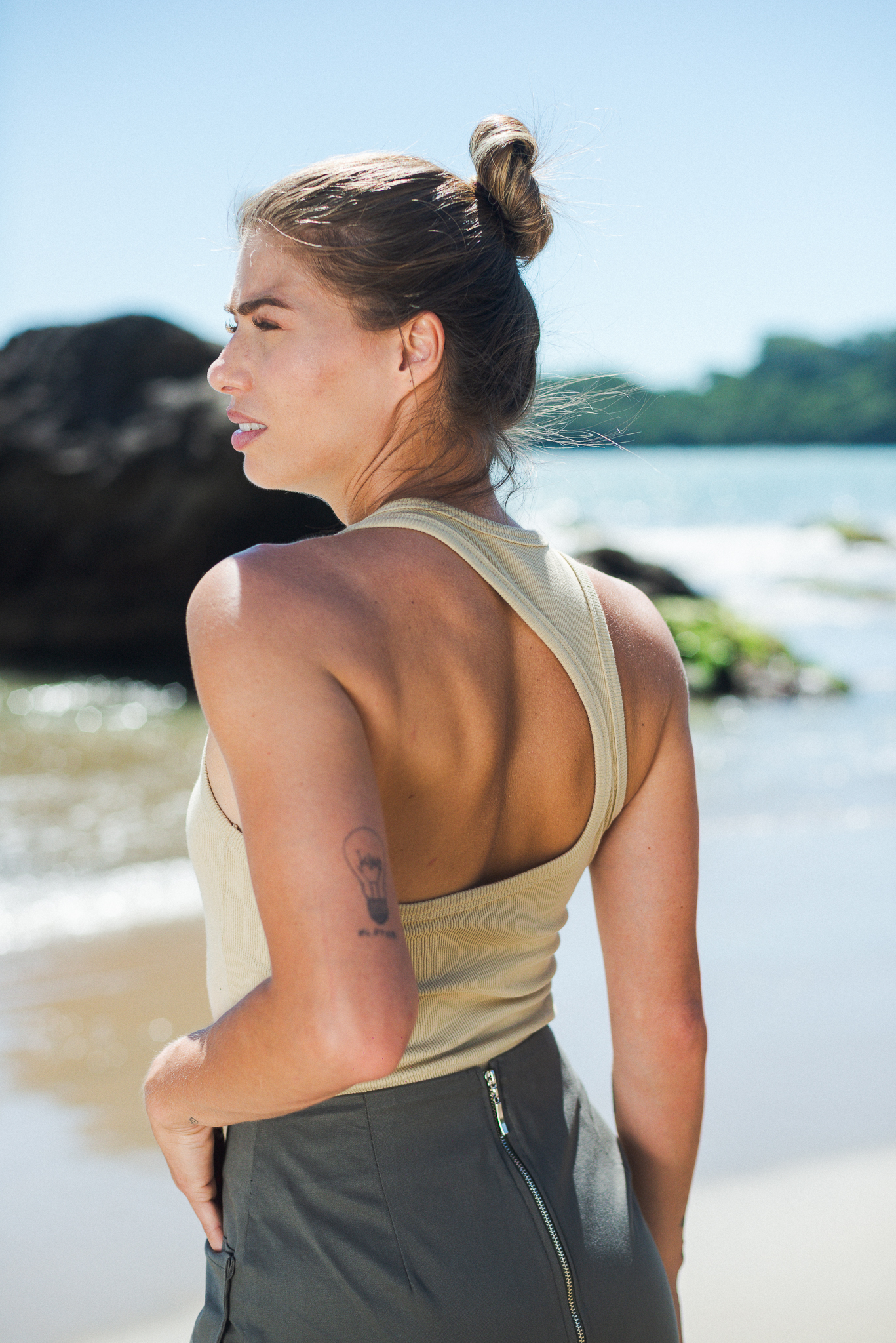 A modelagem é mais curta, pensada para um encaixe próximo, que valoriza a silhueta sem apertar. Funciona sozinha nos dias de calor — fresca, direta, essencial — e também como camada base no inverno, sob camisas, blazers ou peças de alfaiataria.